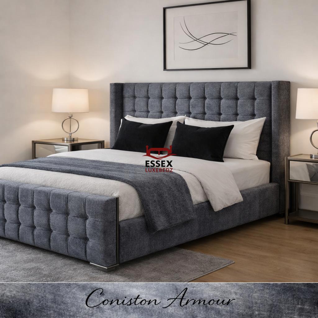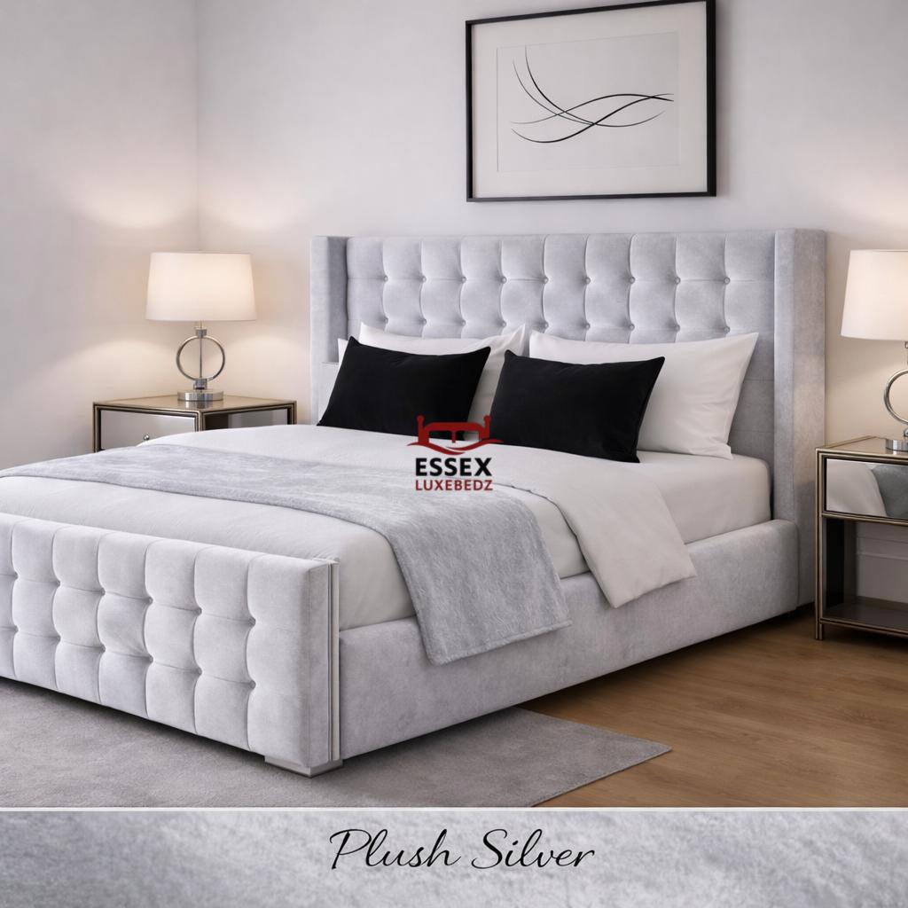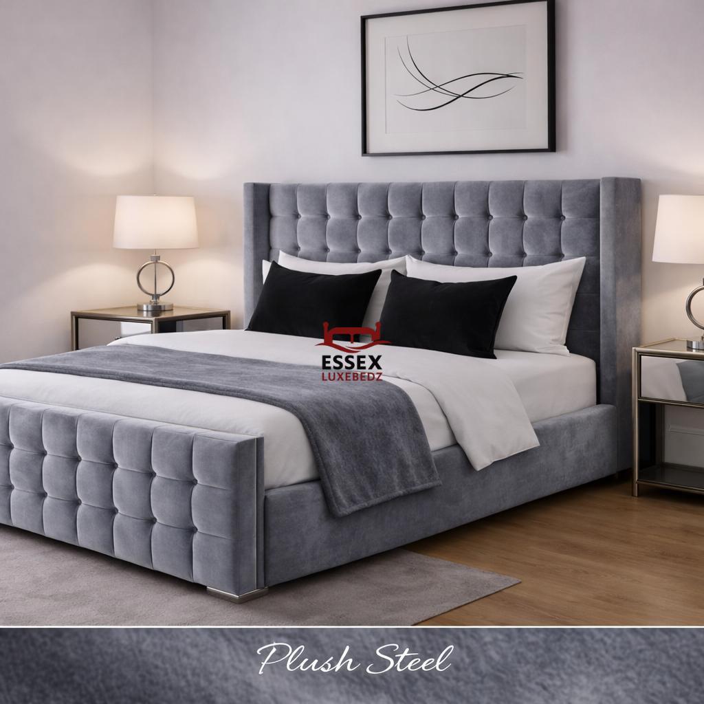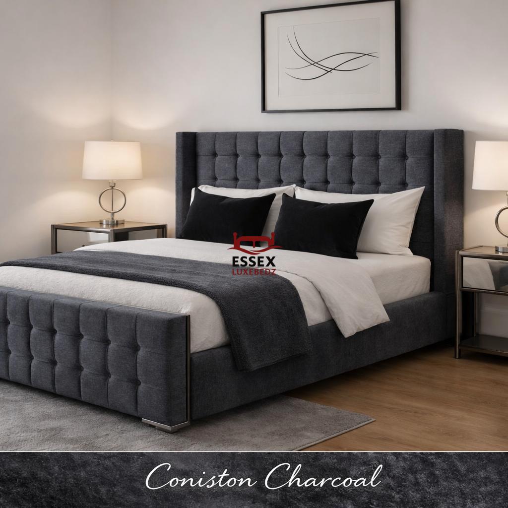 Where style meets sophistication — The Belmont Wing Bed is a beautifully crafted centrepiece that adds timeless charm to any bedroom. Upholstered in luxurious fabric, this bed features a statement winged headboard with sleek, square panel detailing, offering both comfort and striking visual appeal.The structured footboard echoes the headboard’s plush panel design, creating a cohesive and elegant silhouette. With its clean lines, chrome feet, and modern form, The Belmont is ideal for both contemporary and classic interiors.