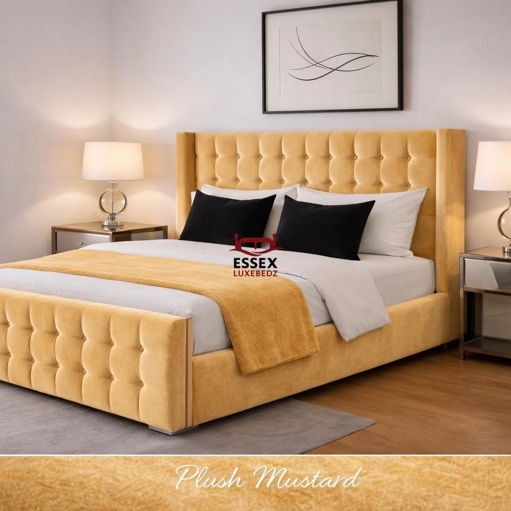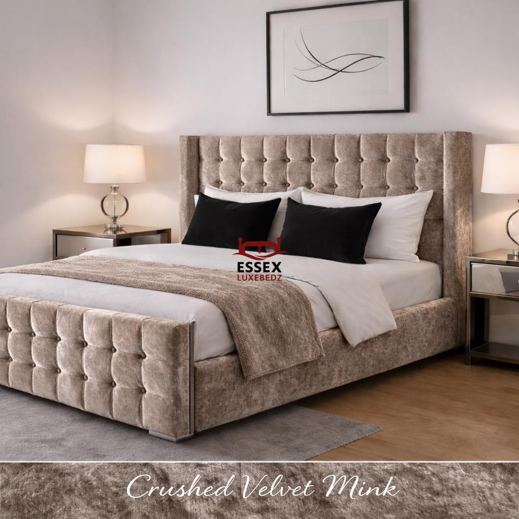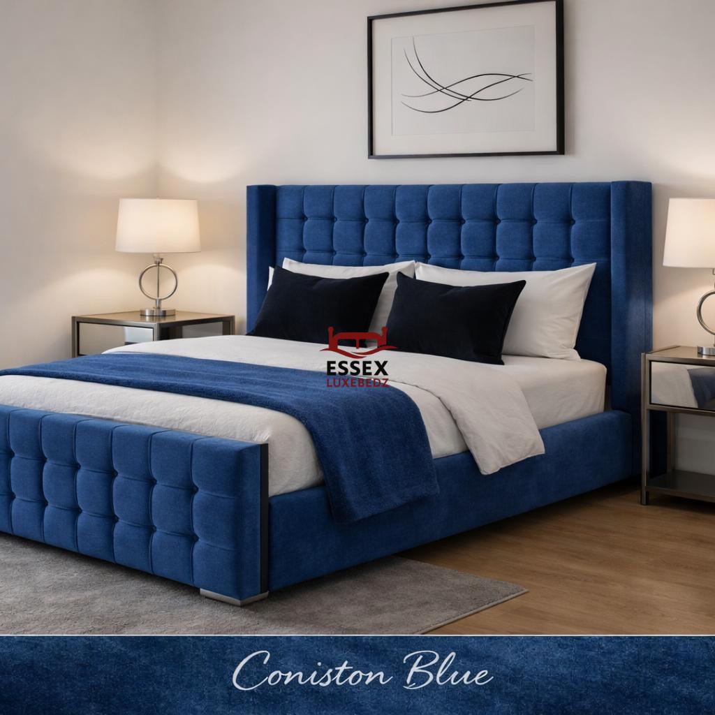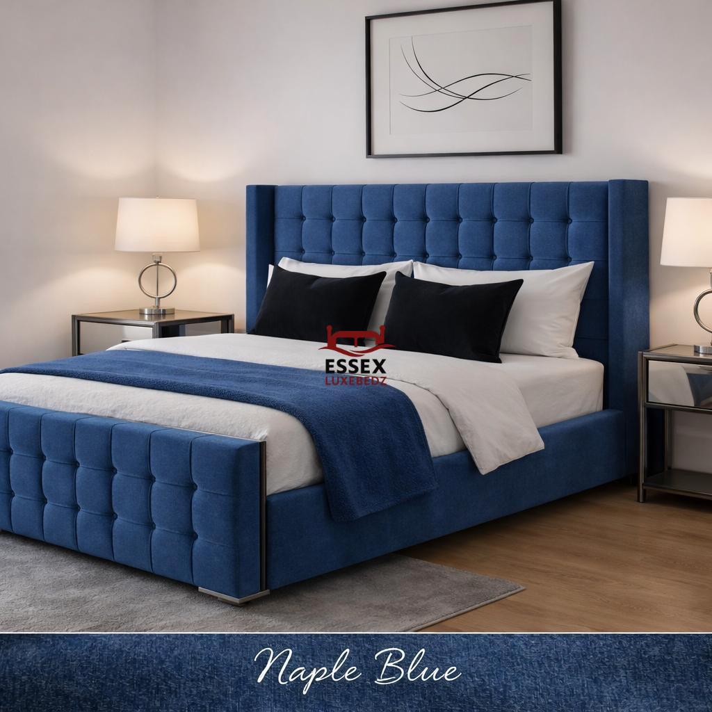 Where style meets sophistication — The Belmont Wing Bed is a beautifully crafted centrepiece that adds timeless charm to any bedroom. Upholstered in luxurious fabric, this bed features a statement winged headboard with sleek, square panel detailing, offering both comfort and striking visual appeal.The structured footboard echoes the headboard’s plush panel design, creating a cohesive and elegant silhouette. With its clean lines, chrome feet, and modern form, The Belmont is ideal for both contemporary and classic interiors.