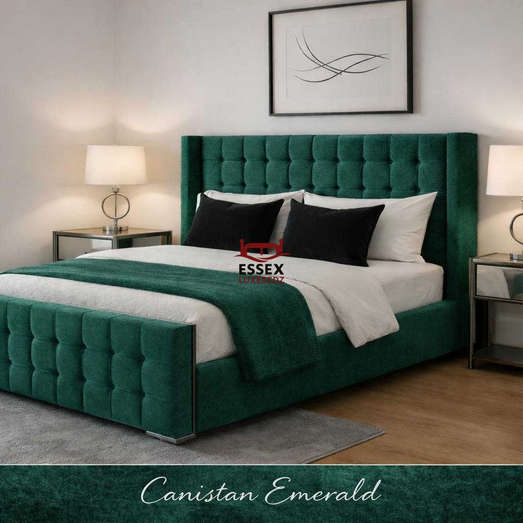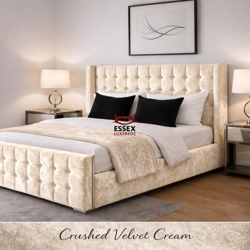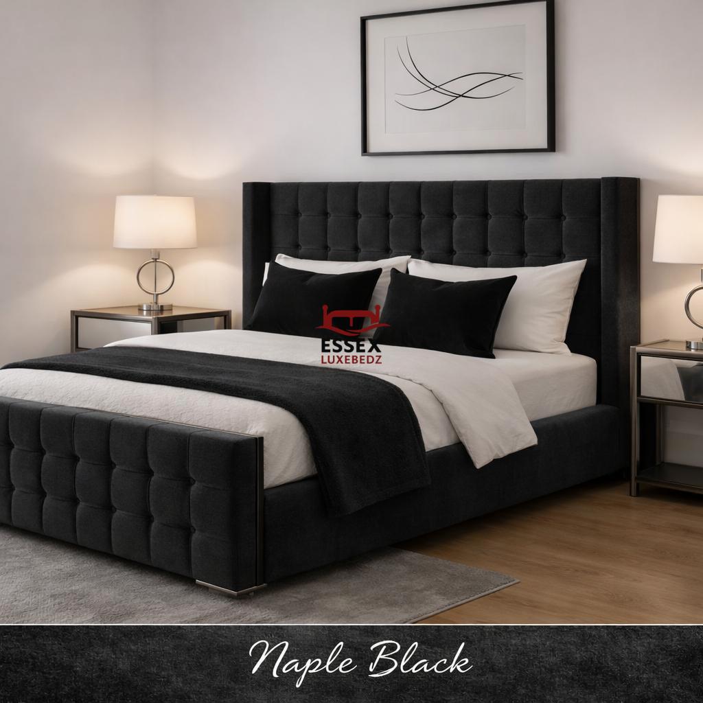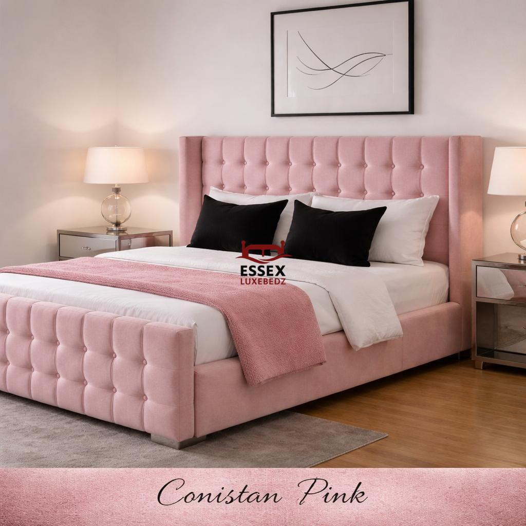 Where style meets sophistication — The Belmont Wing Bed is a beautifully crafted centrepiece that adds timeless charm to any bedroom. Upholstered in luxurious fabric, this bed features a statement winged headboard with sleek, square panel detailing, offering both comfort and striking visual appeal.The structured footboard echoes the headboard’s plush panel design, creating a cohesive and elegant silhouette. With its clean lines, chrome feet, and modern form, The Belmont is ideal for both contemporary and classic interiors.
