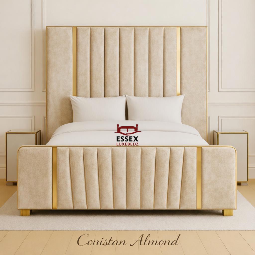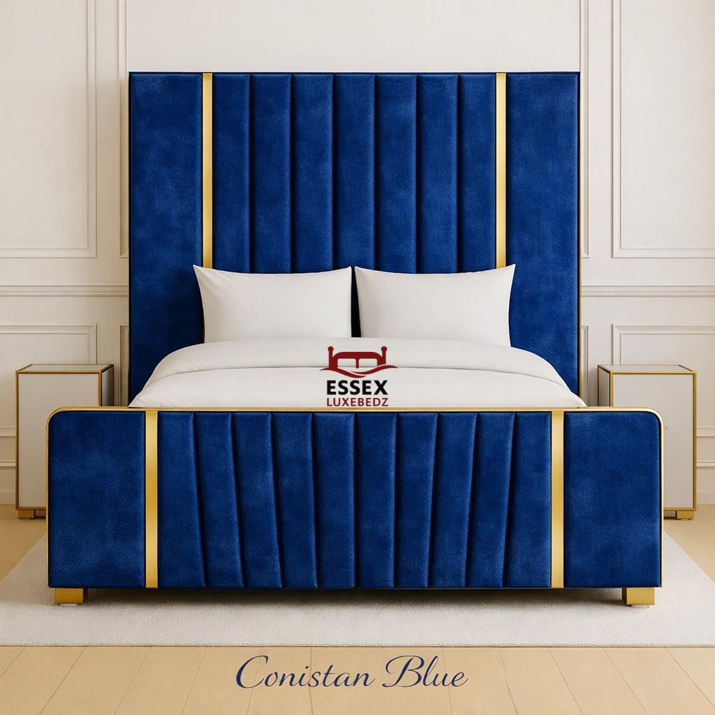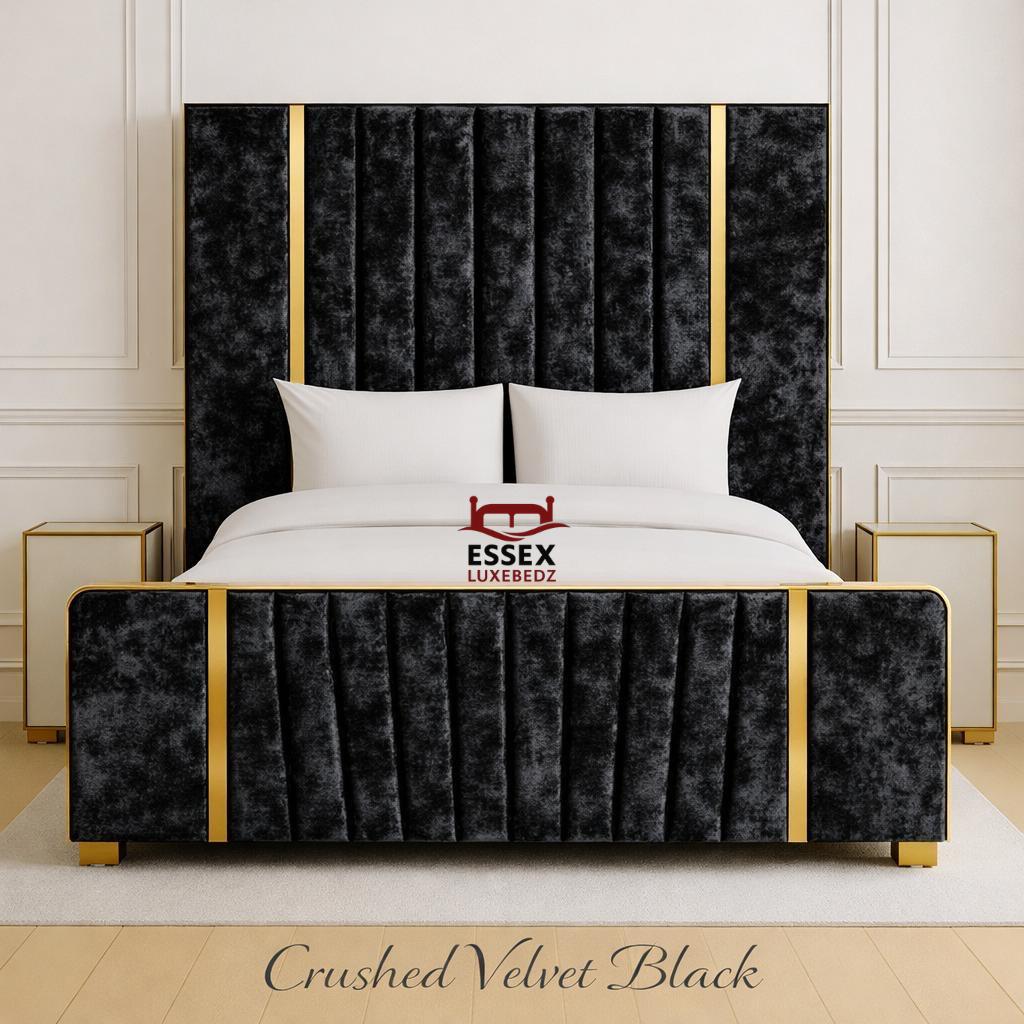 by Essex Luxe Bedz Ltd is the epitome of modern luxury and refined design. Upholstered in elegant silver crushed velvet, it features vertical panel detailing framed by stunning gold accents, creating a bold yet sophisticated aesthetic. The matching footboard mirrors the headboard’s striking lines, delivering a perfectly balanced and opulent look.