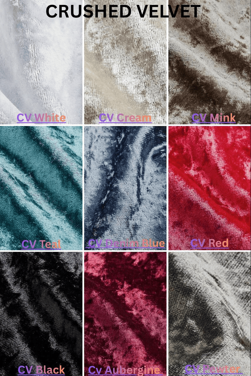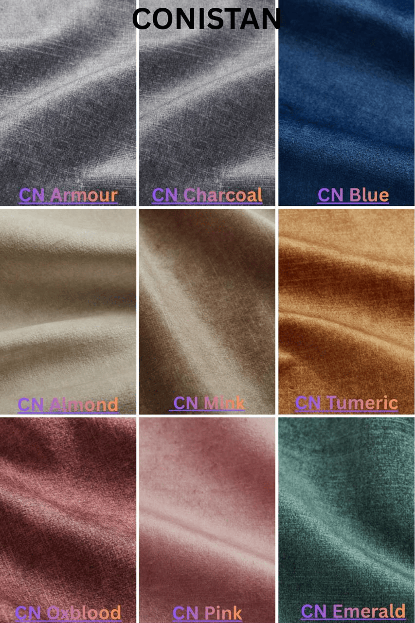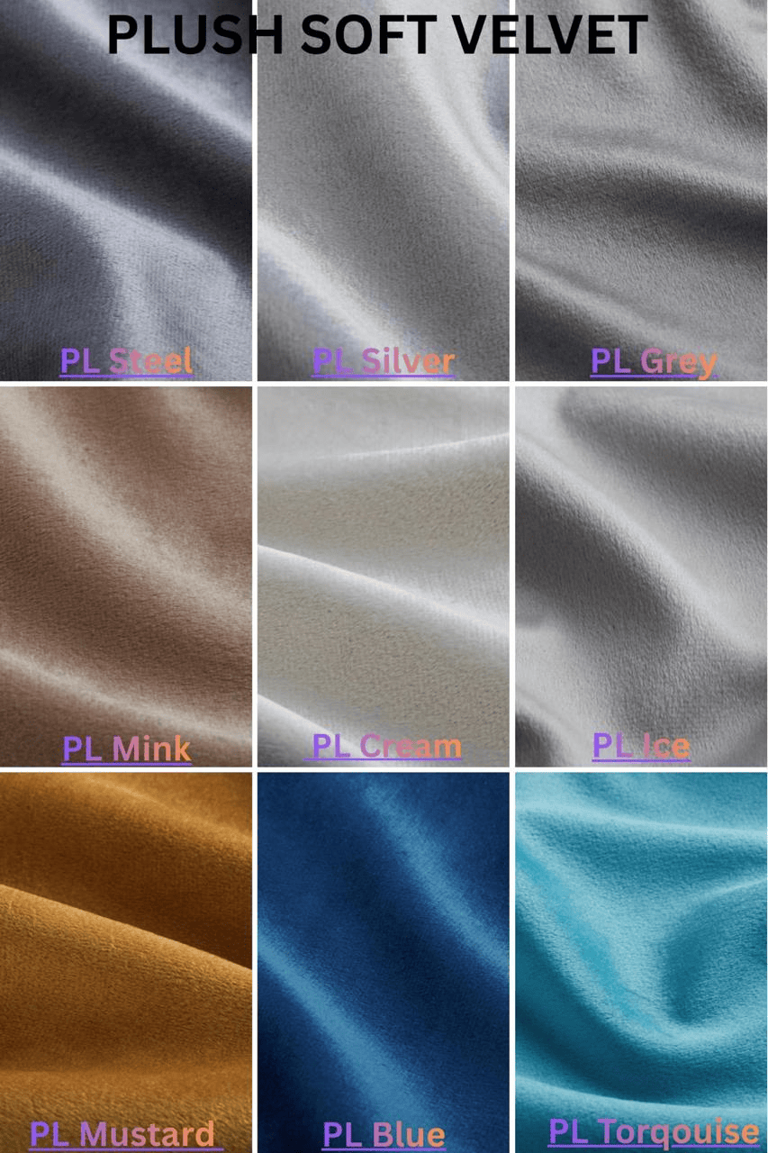 Conistan Almond, Conistan Armour, Conistan Blue, Conistan Charcoal, Conistan Emerald, Conistan Pink, Crushed Velvet Black, Crushed Velvet Cream, Crushed Velvet Mink, Naple Black, Naple Blue, Naple Silver, Plush Creame, Plush Grey, Plush Mustard, Plush Pink, Plush Silver, Plush Steel, Plush Torquoise